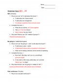 Name: _______________ Date: _______________ Grammar Quiz KEY /20 Will (Umbrella) 1. Why do we use “will” to talk about the future? 1 1. To talk about the “future proche” 2. To talk about an arrangement 3. To indicate a prediction that is almost certain 2. Complete the lyrics: 3 1.