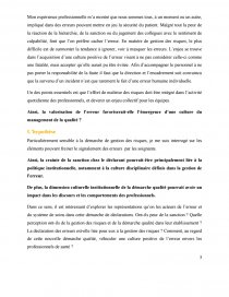 Dans ce sens, il est intéressant d’explorer les représentations qu’on les acteurs de l’erreur et du système de soins dans cette démarche de déclarations. Ont-ils peur de la sanction ? Quelle perception ont-ils de la gestion des risques et de la démarche qualité dans leur établissement ? La déclaration des erreurs est-elle liée pour eux à la gestion des risques ? Comment, au regard de cette nouvelle démarche qualité, véhiculer une culture positive de l’erreur envers les professionnels de santé ?