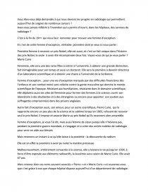 Un petit clin d’œil pour vous toutes mesdemoiselles, c’est peut-être aussi grâce à Marie Curie que les femmes aujourd’hui sont de plus en plus nombreuses dans les universités, qu’elles sont acharnées au travail et réussissent parfois même mieux, enfin qu’elles sont convaincues de leurs droits qu’elles cherchent à faire valoir.