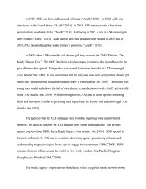 In 1983, AXE was born and launched in France (“Axe®,” 2010). In 2002, AXE was introduced in the United States (“Axe®,” 2010). In 2004, AXE came out with a line of anti-perspirant and deodorant sticks (“Axe®,” 2010). Following in 2005, a line of AXE shower gels were created (“Axe®,” 2010). After shower gels, hair products were created in 2009, and in 2010, AXE became the global leader in men’s grooming (“Axe®,” 2010).