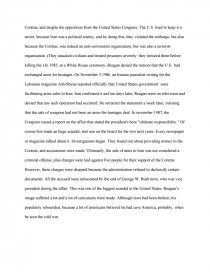 The Iran-Contra Affair was a political scandal that happened in the USA during the second term of Reagan’s Administration, in the years 1985, 1987. This affair is however full of secrets, so it’s hard to know all the details. In the 80’s, the world was in the cold war, which began in 1947, and opposed the world’s greatest power, Soviet Union and the U.S. The U.S supported any anti-communist government to combat the growing power of the USSR. Nicaragua, which is a country involved in the Iran-Contra affair, is in the area influence of the U.S. In Nicaragua, since 1979, the sandinastas, from the FSLN, are in power, after a long civil war. The FSLN is a communist and revolutionary party, so worried, the U.S. stopped any economic help and imposed an embargo. The contras, an anti-communist group fighting the Nicaraguan government, was created. As an anti-communist group, the U.S. started supporting them, by giving them money. Indeed, Reagan wanted to overturn a communist regime, which was in the area of influence of the USA. The US wanted to eradicate communism. To support them, they needed money, that’s what brings us to Iran. Since 1979, when Iranian students invade US embassy in Tehran, and held 52 americans hostage, the relations with Iran were complicated, and in 1980, all diplomatic relations ended: Iran became a political enemy. However, during the second term of Ronald Reagan’s administration, in 1985, Reagan signed a secret finding authorizing a covert program to provide weapons to Iran, funneled initially through Israel. Iran was in the time in war against Iraq, so they needed weapons. The U.S. had hope of having the hostages held in Lebanon by Hezbollah (terrorists loyal to the Ayatollah Khomeini, Iran's leader) released, but only three of them were released and Iran help other ones after. Then, some Iranians were pushing for an alliance with the soviet Union, so Washington wanted to avoid that. But also, unbeknownst from Reagan, they used the money to provide the Contras, and despite the opposition from the United States Congress. The U.S. tried to keep it a secret, because Iran was a political enemy, and by doing this, they violated the embargo, but also because the Contras, was indeed an anti-communist organisation, but was also a terrorist organisation. (They attacked civilians and treated prisoners severely: they tortured them before killing the.) In 1985, at a White House ceremony, Reagan denied the rumors that the U.S. had exchanged arms for hostages. On November 3 1986, an Iranian journalist writing for the Lebanese magazine Ash-Shiraa reported officially that United States government were facilitating arms sales to Iran. Iran confirmed it and ten days later, Reagan went on television and denied that any such operation had occurred. He retracted the statement a week later, insisting that the sale of weapons had not been an arms-for-hostages deal. In november 1987, the Congress issued a report on the affair that stated the president's bore "ultimate responsibility." Of course this made an huge scandal, and was on the board for the two next years. Every newspaper or magazine talked about it. Investigations began. They found out about providing money to the Contras, and accusations were made. Ultimately, the sale of arms to Iran was not considered a criminal offense, plus charges were laid against five people for