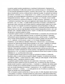 Le premier quatrain semble caractérisé par un sentiment d’enfermement, d’oppression du spleen sur Baudelaire. En effet, dès le premier vers ce dernier évoque un « ciel bas et lourd ». Le ciel symbolise généralement la liberté, l’ouverture mais le terme « bas » vient perturber cette idée en transformant le ciel en un élément fermé, enfermant le poète. Ce sentiment est renforcé par le terme « couvercle » (v.1), « longs ennuis » (v.2), « cercle » (v.3) ou encore « nuits » (v.4). Ce premier vers semble également caractérisé par un sentiment de lourdeur comme le laissent transparaître les termes « lourd », « pèse » ou « couvercle » (v.1). Ensuite, le vers 2 semble quant à lui empreint à un sentiment de tristesse. En effet, les termes « gémissant » ou « ennuis » confirment ce sentiment. Nous retrouvons également cette tristesse dans le dernier vers avec les termes « noir » et « triste ». Le poète semble soumis face à sa douleur, il est passif et ne réussit pas à lutter contre ainsi que le laisse entendre le participe présent utiliser pour le verbe gémir. Les vers 3 et 4 rappelle ce sentiment d’oppression subit par Baudelaire. En effet, les termes « horizon » et « jour » qui évoquent généralement un sentiment de liberté semblent eux aussi soumis à ce mal qui ronge Baudelaire comme le laisse transparaître le terme « noir » par exemple. Enfin, l’utilisation répétée du terme « Quand » en début des trois premiers quatrains fait découler un sentiment pesant du temps.