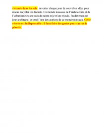J’appartiens à une génération qui devra réparer vos erreurs, pour éviteren particulier le réchauffement climatique. J’ai hâte de devenir architecte pour participer à l’amélioration des constructions : installer plus de verdure entre les maisons pour que l’eau de s’écoule dans les sols ; inventer chaque jour de nouvelles idées pour mieux recycler les déchets. Un monde nouveau de l’architecture et de l’urbanisme est en train de naître et je m’en réjouis. En devenant un jour architecte, je serai l’une des actrices de ce monde nouveau. Cette révolte est indispensable : il faut faire des gestes pour sauver la planète.