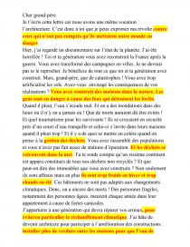 Hier, j’ai regardé un documentaire sur l’état de la planète. J’ai été horrifiée ! Toi et ta génération vous avez reconstruit la France après la guerre. Vous avez transformé des campagnes en villes. Je ne devrais pas te le reprocher. Je bénéficie de tout ce que toi et ta génération avez construit. Mais, grand-père, que de catastrophes ! Vous avez trop artificialisé les sols. Avez-vous envisagé les conséquences de vos réalisations ? Vous avez construit des maisons dans la nature. Les gens sont en danger à cause des feux qui détruisent les forêts. Quand il pleut, l’eau s’écoule mal. Et on a des inondations dans des lieux où il n’y en a jamais eu ! Que de morts auraient dû être évités ! Et quel traumatisme pour les survivants ! Ils se croyaient en sécurité près d’un cours d’eau tranquille et celui-ci s’invite dans leurs maisons quand il pleut trop ! Et il y a de quoi se mettre en colère quand on pense à la gestion des déchets. Vous avez rassemblé des populations et vous n’avez pas fait assez de stations d’épuration. Et les déchets se retrouvent dans la mer. Tu te rends compte qu’un sixième continent est apparu constitués de tous nos déchets non recyclés ? Et que peut-on dire des immeubles que vous avez construits ? Non seulement ils sont affreux mais en plus ils sont trop froids en hiver et trop chauds en été. Ces bâtiments ne sont pas adaptés aux changements climatiques. Donc, on a encore des morts ! Des personnes fragiles, notamment des personnes âgées, meurent chaque année dans leur appartement à cause de fortes canicules.