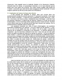C’est un guide qui semble rester neutre devant ce spectacle. Des vers concis nous présentent différentes images de ce charnier : « des pieds à travers tout » (v5), «légèrement en l’air et hardie une jambe – de femme bien sûr » (v12-13). le trait d’union entre « jambe » et « femme » semble indiquer qu’il ait pris un instant pour discerner dans ce fatras ce qu’il regardait et ainsi indiquer avec précision ce qu’il souhaitait nous montrer. L’adverbe « bien sûr » (v13) souligne la certitude que cette jambe était belle, c’est la jambe d’une femme. Il surenchère en disant que c’est « une jambe jeune / Avec un bas noir », (v14-15). Nous sommes pendant la guerre, les femmes qui possédaient de « bas » étaient rares. C’était certainement une femme qui faisait très attention à son apparence et qui avait de l’argent. Il finit en remontant sur sa cuisse « une vraie » (v17) rajoute-t-il. « Vraie » peut signifier soit qu’elle est bien en chair, soit qu’elle est belle.