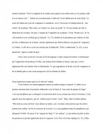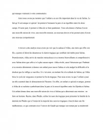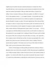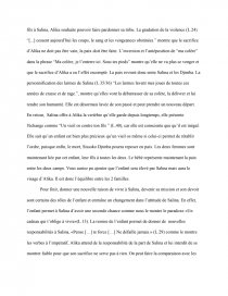 Ensuite, la fin du tragique est rendue possible par le douloureux sacrifice qu’Alika est déterminée à faire et qui révèle sa force incroyable. En effet, Alika poussée par la culpabilité de ce qu’a infligé son peuple à Salina, est prête à tout pour la retrouver. Dès la première réplique, la gradation “Je te retrouve enfin, Salina. Des jours entiers à ta poursuite. Sans jamais m’arrêter.” (L.3) montre bien sa détermination et traduit déjà une certaine obsession. On retrouve aussi son côté obsessionnel à la troisième réplique avec le paradoxe “ [...] je te supplie d’accepter.” (L.6). Ce paradoxe est renforcé par le fait qu’Alika est la femme du chef de la tribu alors que Salina est une bannie : hiérarchiquement parlant, Alika ne devrait jamais supplier Salina d’accepter un cadeau. Cette obsession est de nouveau montrée à la réplique cinq, “Je n'ai pas cessé de penser à toi. Tu hantais mon esprit avec ton dos voûté et ton visage d'effroi.” (L.8) puis encore avec ”Mais tu hantais mes nuits” (L.10). Ces métaphores hyperboliques comparent Salina à un esprit qui hante Alika, c’est ainsi qu’elle traduit son sentiment de culpabilité face à l’absence de pardon de la part de son peuple et pour le destin auquel ils l’ont condamnée. C’est cette culpabilité qui est la source de l’obsession d’Alika et par ce sacrifice, elle souhaite se racheter au nom de sa tribu. En effet, Alika sert de lien entre les deux camps et elle est la seule de la tribu à avoir pensé à Salina et à s’être sentie coupable de sa situation. On découvre ainsi, un personnage autodidacte. La gradation “J’ai pensé” (L.9); ”J’ai réfléchi”(L.11); “Je suis venue” (L.13) montre l’évolution de sa pensée. Elle agit par elle-même et selon le fruit de sa propre réflexion. On retrouve de nouveau cette indépendance d’esprit avec “ j’ai pensé d'abord, comme lui, que tu étais folle [...]” (L.10), elle montre qu’elle est capable de se forger son propre avis indépendamment de ce que pense son mari qui reste, tout de même, le chef de la tribu. Alika est donc une femme forte d’autant plus que ce sacrifice est plus que douloureux pour elle étant la mère de l’enfant. Tout au long de cette scène, on peut voir que donner cet enfant la fait beaucoup souffrir. On peut d’abord le voir dans la réplique neuf, ”Je ne dis pas que je te le donne avec facilité. Le dernier-né, pour une mère, c'est l'enfant auréolé. Je sais que je ne cesserai de penser à lui.” (L.20) où elle insiste sur la difficulté de la séparation. Alika rappelle son côté maternel en se désignant par la périphrase “une mère” et en montrant qu’une telle séparation serait impossible pour la plupart des mères. On voit donc son immense force émotionnelle et mentale. D’autant plus qu’elle a conscience de ce qu’elle s’inflige, “Je sais que je ne cesserai de penser à lui” (L.21) mais persiste dans