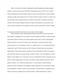 Salina, est une pièce de théâtre contemporaine qualifiée également de théâtre tragique antique, et a été écrite par Laurent GAUDÉ, un dramaturge reconnu, en 2003. Acte ? Scènes ? Dans le passage que nous allons étudier, Salina est sauvée par la puissance de l’amour maternel transmis par Alika, qui lui donne la force et le désir d’enterrer à jamais sa haine et sa colère, ainsi que d’accorder enfin ce pardon maintes fois sollicité. On peut donc se demander comment le sacrifice d’une mère peut changer la destinée de Salina. Pour répondre à cette question, nous verrons d’abord comment la fin du tragique a été mise en place, puis quel est le rôle de l’enfant.
