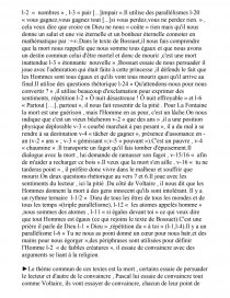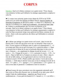 ▲Pascal essaye de nous convaincre avec des arguments rationnels qu'il faut croire en Dieu afin d'assurer une vie éternelle et un salut ,pour cela il emploi l'aide des mathématique , rappelons que Pascal est un mathématicien , il nous parle de hasard (l-21 « hasard ») , l-1 « un infini » ; l-2 « nombres » , l-3 « pair [...]impair ».Il utilise des parallélismes l-20 « vous gagnez,vous gagnez tout [...]si vous perdez,vous ne perdez rien. » , cela veux dire que croire en Dieu ne nous « coûte » rien mais qu'il nous donne un salut et une vie éternelle et un bonheur éternelle connoter en mathématique par :+∞.Dans le texte de Bossuet,il nous fais comprendre que la mort nous rappelle que nous somme tous égaux et que nous avons un destin commun celui d'être mortel et donc de mourir ,c'est une mort inattendue l-3 « étonnante nouvelle » ,Bossuet essaie de nous persuader il joue avec l'admiration qui était faite à cette princesse ,il défends le fait que les Hommes sont tous égaux et qu'ils vont tous mourir quoi qu'il arrive au final.Il utilise des questions rhétorique l-24 « Qu'attendons-nous pour nous convertir ? » ,il utilise beaucoup d'exclamation pour exprimer des sentiments, répétition l-2 « Ô nuit désastreuse ! Ô nuit effroyable » et l-6 « Partout […], partout », il nous fait ressentir de la pitié . Pour La Fontaine la mort est une guérison , mais l'Homme en as peur, c'est un lâche.On nous indique que c'est un vieux bûcheron v-2 « que des ans » ,il a une position physique déplorable v-3 « courbé marchait à pas pesant », il a du mal à se rendre à sa destination v-4 « tâcher de gagner », présence d'assonance en -an (v-2 « ans » ; v-3 « gémissant »;v-5 « pouvant »).C'est un pauvre , v-4 « chaumine » .Il transporte un fagot qu'il fais tomber d'épuisement.Il dialogue avec la mort , lui demande de ramasser son fagot , v-15/16 « afin de m'aider a recharger ce bois ».Il veux que la mort s'en aille , v-16 « tu ne tarderas point » , il préfère donc vivre dans le malheur et souffrir que mourir.On deux questions rhétorique au vers 7 et 6.Il joue avec les sentiments du lecteur , ici la pitié .Du côté de Voltaire , il nous dit que les Hommes donnent la mort à des gens innocent qu'ils sont intolérant. Il y a un rythme ternaire l-1/2 « Dieu de tous les êtres de tous les mondes et de tous les temps »(triple parallélisme), l-12 « les atomes appelés homme » ,nous sommes des atomes , l-11 « si égales devant toi » ce qui veux dire que tout Hommes est égaux (ce qui rejoins le texte de Bossuet).C'est une prière il parle de Dieu l-1 « Dieu » ,répétition du « à toi » (l-1,l-4).Il y a un parallélisme l-6 « Tu ne nous as point donné un cœur pour nous haïr,et des mains pour nous égorger »,des périphrases sont utilisées pour définir l'Homme l-2 « de faibles créatures », il essaie de convaincre avec des arguments se liant à la religion.