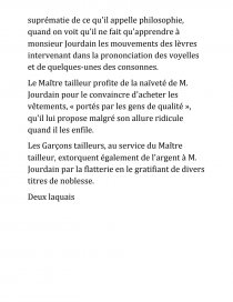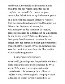 En s’inspirant des auteurs antiques, Molière écrit des comédies de caractères dénonçant les défauts des hommes « L’Avare, Le Misanthrope » et des comédies de mœurs, satires des usages de la fortune et de la noblesse de son temps « Les Précieuses Ridicules, Le Bourgeois Gentilhomme » certaines de ses pièces sont des comédies-ballet qui comportent chant, théâtre et dance écrites en collaboration avec les musiciens Jean-Baptiste Charpentier « Le Malade Imaginaire »