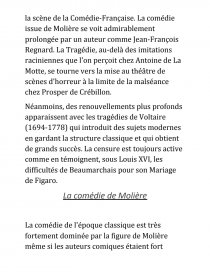 Néanmoins, des renouvellements plus profonds apparaissent avec les tragédies de Voltaire (1694-1778) qui introduit des sujets modernes en gardant la structure classique et qui obtient de grands succès. La censure est toujours active comme en témoignent, sous Louis XVI, les difficultés de Beaumarchais pour son Mariage de Figaro.