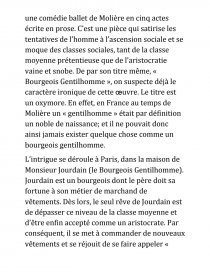 Apparue en 1670, Le bourgeois gentilhomme Le Bourgeois Gentilhomme est une comédie ballet de Molière en cinq actes écrite en prose. C’est une pièce qui satirise les tentatives de l’homme à l’ascension sociale et se moque des classes sociales, tant de la classe moyenne prétentieuse que de l’aristocratie vaine et snobe. De par son titre même, « Bourgeois Gentilhomme », on suspecte déjà le caractère ironique de cette œuvre. Le titre est un oxymore. En effet, en France au temps de Molière un « gentilhomme » était par définition un noble de naissance; et il ne pouvait donc ainsi jamais exister quelque chose comme un bourgeois gentilhomme.