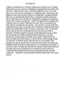 C'était un dimanche soir, le temps n'était pas au rendez-vous. Prunette était seule avec son enfant. Ils habitaient un appartement au centre-ville de Paris. Il était tout pour elle, ce petit Max âgée de 4 ans. Il n'y avait pas un jour sans que le voisinage ne se plaignait pas, il fessait que des bêtises et crier sans moindre raisons. Le lendemain, Prunette emmena Max pour lui achetait des habits dans un magasins qu'elle aimait bien, ce qui n'était pas le cas de Max qui détestait les magasins de vêtement. Ce jour-là il y avait un monde fou , quand Prunette sortit du magasin elle s'aperçut que son enfant n'était pas avec elle. Elle ne savait pas quoi faire, elle ne s’arrêtait plus de pleurer. A ce moment, une jeune femme s'approcha pour savoir ce qu'elle avait. Prunette lui expliqua qu'elle avait perdue son enfant Max et elle ne savait ni quoi faire, ni où, ni comment. Alors la jeune femme lui demanda de venir avec elle pour aller le chercher. Prunette accepta et rajouta qu'elle était aller au parc en face de l'animalerie, qu'il était de taille grande et plutôt gros. Les deux femmes se rendit aussitôt. Prunette retrouva Max, il était entrain de jouer au ballon avec des enfants. La jeune femme était soulagé qu'elle l'ai retrouvé. Prunette le laissa s'amuser tout en le surveillant. Elle expliqua à la jeune femme que si il pouvait rentrer dans une équipe de football il serait sûrement un grand joueur car il adorait jouer au ballon. Il se fit tard, alors Prunette alla chercher son enfant qu'elle aimait tant et le pris dans ses bras et l'expliqua qu'il ne fallait pas partir comme sa.