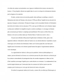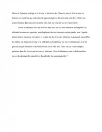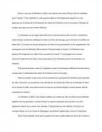 Pensez-vous que la littérature d’idées soit toujours une arme efficace afin de combattre pour l’égalité ? Vous répondrez à cette question dans un développement organisé en vous appuyant sur la lecture de la Déclaration des droits de la femme et de la citoyenne d’Olympe de Gouges ainsi que sur votre culture littéraire