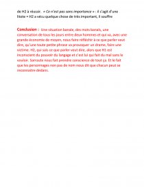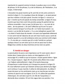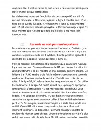 La ponctuation là aussi a son importance car H1 veut savoir, donc il insiste donc il passe plus ou moins un interrogatoire a H2. Il encourage H1 a révélé ce qui le tracasse « Essaie quand même » ligne 14, « Essaie toujours » ligne 44. H1 prend cette affaire très à cœur « je t’adjure solennellement » ligne 25 et porte beaucoup d’importance à cette histoire car il évoque les parents à la ligne 25. H1 veut tellement savoir qu’il devient sérieux puis devient plus léger car le sérieux n’a pas marché, il utilise le côté plaisantin. Au début il essais de jouer sur les sentiments mais ça ne marche pas non plus comme on peut le voir aux lignes 12 et 13. H1 utilise des questions rhétoriques. On voit donc que H1 a le rôle de l’acquisiteur, il demande deux comptes. H2 est très vague dans ses paroles, il ne veut rien dire. Il utilise même le mot « rien » très souvent ainsi que le mot « mots » ce qui est très flou.