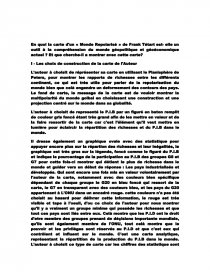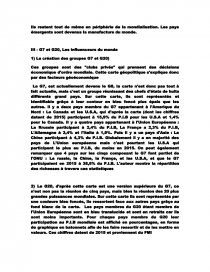 Cette carte géopolitique à échelle mondiale est un planisphère pour représenter l'ensemble du monde en projection plane, cette nature à été choisi par l'auteur afin de mettre ne valeur l'impact des groupes G7 et G20 sur le monde entier, de montrer la diversité et les différences entre les territoires et de montrer l’organisation du monde actuel selon une lecture géopolitique et géo économique. On ne peut avoir beaucoup de doutes sur la fiabilité de cette carte car elle est publiée dans Atlas, écrit sous la direction de Frank Tétart, un géopolitologue français, intitulé « Comprendre le Monde en 200 cartes, Grand Atlas 2018 ». Elle a donc été publiée par un expert. L'avantages des choix de l'auteur est la facilité de lecture et de compréhension de la carte, même si cela engendre un inconvénient : Le manque de détails et de précisions, car tout ne peut être representé sur un planisphère. Cette carte permet de comprendre notre monde actuel car elle a été publiée en 2018. Cette carte montre donc la polarisation du monde, le rôle de l'ONU dans le rassemblement des puissances, de l'impact économique de la mise en place du G7 et du G20 et de la répartition des richesses qu'engendre cette repolaristaion. Mais que cherche à montré cette carte et pourquoi?