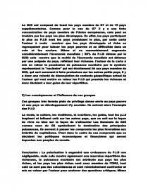 Il dresse également un graphique ovale avec des statistique pour appuyer encore plus sur la répartion des richesses et leur inégalités, le graphique est très gros sur la légende, foncé comme le figuré du P.I.B et indique le pourcentage de la participation au P.I.B des groupes G8 et G7 pour cette fois-ci montrer qui détient le plus de richesse dans le monde et guider vers un début de réponse : Les pays industrialisés et développés. Qui sont encore une fois mis en valeur volontairement par l'auteur de la carte, notamment avec des couleurs bien spécifique dépendant de chaque groupe le G20 en bleu foncé qui ressort de la carte, le G7 en transparent avec des couteurs bleu, et les pays du G20 appartenant à L'ONU dans un encadré rouge. cette couleure n'a pas été choisit au hasard pour délivrer cette information, le rouge est très visible et tape à l'oeuil, d'ou ce choix de l'auteur pour nous montrer qu'il y a vraiment un groupe minime qui possède les richesses et que tout ces pays sont liés entre eux. Celà montre que les P.I.D ont le droit d'etre membre des groupes prenant de déçisions importante mondiale, qu'ils sont également membre de l'ONU, tout celà montre que le pouvoir et les privilèges sont réservés au P.I.D et que c'est eux qui contrôlent et influent sur le monde. C'est une carte analytique, représentant la répartition de la production du P.I.B dans le monde. L'auteur à choisit ce type de carte car les chiffres des statistique sont plus évocateurs, mais c'est par conséquent une carte anamorphose. Le paramètre de la carte est le P.I.B par état, elle exprime une réalité géopolitique et géoéconomique.