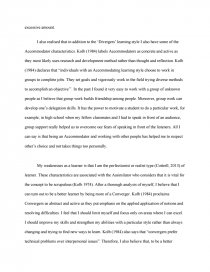I also realised that in addition to the ‘Divergers’ learning style I also have some of the Accommodator characteristics. Kolb (1984) labels Accommodators as concrete and active as they most likely uses research and development method rather than thought and reflection. Kolb (1984) declares that “individuals with an Accommodating learning style choose to work in groups to complete jobs. They set goals and vigorously work in the field trying diverse methods to accomplish an objective’’. In the past I found it very easy to work with a group of unknown people as I believe that group work builds friendship among people. Moreover, group work can develop one’s delegation skills. It has the power to motivate a student to do a particular work, for example; in high school when my fellow classmates and I had to speak in front of an audience, group support really helped us to overcome our fears of speaking in front of the listeners. All I can say is that being an Accommodator and working with other people has helped me to respect other’s choice and not takes things too personally.