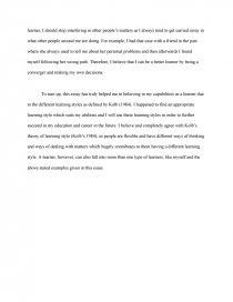 Kolb (1984, 41) says that “Education is the procedure whereby knowledge is shaped through the transformation of practice”. Knowledge results from the mixture of avaricious skills and converting it. This is called a ‘learning style’. Kolb called this “Experiential Learning” since “knowledge is the foundation of learning and growth” (Kolb1984). Each ends of the nodes in “experiential learning” provide a phase in the learning process. I learnt that according to Kolb’s theory (1984) there are four types of learners which are “the divergers”, “the convergers”,” the assimilators” and “the accommodators”. Therefore, in this essay I am going to concentrate and discuss on the category of learner I am, clarify Kolb’s theory and its in-depth connection to my previous learning experience, refer to the ways of how I could become a superior learner and conclude that ‘learning styles’ are vital for a healthier and efficacious learning.