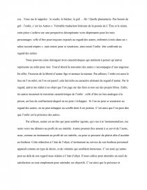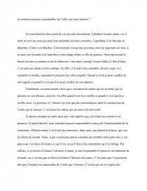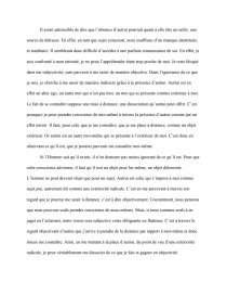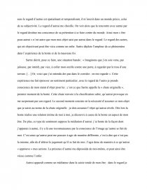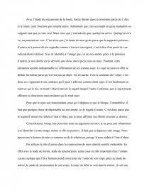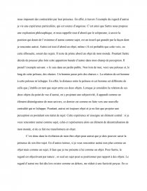 C’est donc dans la révélation de mon être-objet pour autrui que je dois pouvoir saisir la présence de son être-sujet. En d’autres termes, si je veux rencontrer autrui non plus comme un objet mais comme un sujet, il faut que je me présente à lui comme un objet. Pour Sartre, le regard est objectivant par nature ; or seul un sujet peut se positionner par rapport à des objets. Le regard d’autrui me fait dès lors exister comme un dehors, me réduit à une facticité perçue. En ce sens le regard d’autrui est spatialisant et temporalisant, il m’inscrit dans un monde précis, celui de sa subjectivité. Le regard d’autrui me chosifie. On voit alors que la rencontre avec autrui par le regard destitue ma conscience de sa prétention à se faire centre du monde. Ainsi mon « être pour-autrui » n’est autre que mon moi-objet saisi par autrui dans le regard. Le regard des autres, qui est objectivant peut être vécu comme un enfer.