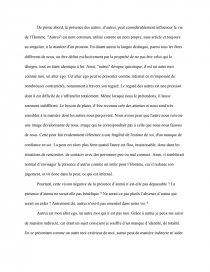De prime abord, la présence des autres, d’autrui, peut considérablement influencer la vie de l’Homme. "Autrui" est nom commun, utilisé comme un nom propre, sans article et toujours au singulier, à la manière d'un pronom. En disant autrui la langue distingue, parmi tous les êtres différents de nous, un être défini exclusivement par la propriété de ne pas être celui qui le désigne, tout en étant identique à lui. Ainsi, "autrui" désigne quiconque, il est un autre moi comme moi, un alter ego. Cet alter ego peut se présenter comme infernal en m’imposant de nombreuses contrariétés, notamment à travers son regard. Le regard des autres est une pression dont il est difficile de s’affranchir totalement. Même lorsque nous le prétendons, il laisse rarement indifférent. Le besoin de plaire, d’être reconnu crée des attentes et nous rend très sensibles à la manière dont les autres nous perçoivent. Nous avons peur que l'autre nous renvoie une image dévalorisante de nous, image qui ne correspondrait pas à celle que nous nous faisons de nous. Cette peur fait évidemment référence à une fragilité de l'estime de soi, d'un manque de confiance en soi. La peur est alors plus forte quand l'autre est flou, insaisissable, donc dans les situations de rencontres, de contacts avec des personnes peu ou mal connues. Ainsi, il semblerait normal d’envisager la présence d’autrui comme un enfer pour l’Homme, car il redoute son jugement, et vit donc dans la peur, ce qui est infernal.