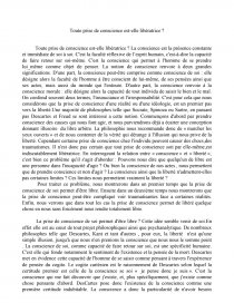 Toute prise de conscience est-elle libératrice ? La conscience est la présence constante et immédiate de soi à soi. C'est la faculté réflexive de l’esprit humain, c'est-à-dire la capacité de faire retour sur soi-même. C'est la conscience qui permet à l'homme de se prendre lui_même comme objet de penser. La notion de conscience renvoie à deux grandes significations. D'une part, la conscience peut-être comprise comme conscience de soi : elle désigne alors la faculté de l'homme à être conscient de lui-même, de ses pensées ainsi que ses actes, mais aussi du monde qui l'entoure. D'autre part, la conscience renvoie à la conscience morale : elle désigne alors la capacité de tout individu de saisir le bien et le mal. On confond souvent deux termes, l'insouciance et l'irresponsabilité. C'est pour cela que nous considérons que la prise de conscience d'une réalité ou d'une idéologie, est un premier pas vers la liberté.Une majorité de philosophes telle que Socrate, Spinoza ou Sartre, en passant pas Descartes et Freud se sont intéressé a cette notion. Commençons d'abord par prendre conscience des causes qui nous font agir, et nous parviendrons déjà a écarter une conception donnant illusoire du libre arbitre. La philosophie nous recommande donc de « marcher les yeux ouverts » et de nous contenter de la vérité qui dérange à l'illusion qui nous prive de la liberté. Cependant certaine prise de conscience chez l'individu peuvent causer des chocs,des traumatismes. Il n'est donc pas certain que tout prise de conscience soit par elle-même,est indiscutablement libératrice. En interrogeant la relation entre « conscience » et « liberté », c'est bien ce problème qu'il s'agit d'aborder : Pouvons nous dire que quelqu'un de libre est une personne dans l'incapacité d'agir ? Ou bien la conscience de nos actes , nous permettent que de prendre conscience et non d'agir ? La conscience ainsi que la liberté n'admettent-elles pas certaines limites ? Ces limites nous permettent vraiment la liberté ?