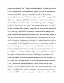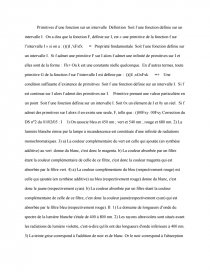 Primitives d’une fonction sur un intervalle Définition Soit f une fonction définie sur un intervalle I. On a dira que la fonction F, définie sur I, est « une primitive de la fonction f sur l’intervalle I » si on a : ()()I ,'xFxfx∀∈= Propriété fondamentale Soit f une fonction définie sur un intervalle I. Si f admet une primitive F sur I alors f admet une infinité de primitives sur I et elles sont de la forme : Fk+ Où k est une constante réelle quelconque. En d’autres termes, toute primitive G de la fonction f sur l’intervalle I est définie par : ()()I ,xGxFxk∀∈=+ Une condition suffisante d’existence de primitives Soit f une fonction définie sur un intervalle I. Si f est continue sur I alors f admet des primitives sur I. Primitive prenant une valeur particulière en un point Soit f une fonction définie sur un intervalle I. Soit 0x un élément de I et 0y un réel. Si f admet des primitives sur I alors il en existe une seule, F, telle que : ()00Fxy. 00Fxy Correction du DS n°2 du 01/02/05 : I 1) On associe bleu et 450 nm ; vert et 540 nm ; rouge et 680 nm. 2) La lumière blanche émise par la lampe à incandescence est constituée d'une infinité de radiations monochromatiques. 3) a) La couleur complémentaire du vert est celle qui ajoutée (en synthèse additive) au vert donne du blanc, c'est donc le magenta. b) La couleur absorbée par un filtre étant la couleur complémentaire de celle de ce filtre, c'est donc la couleur magenta qui est absorbée par le filtre vert. 4) a) La couleur complémentaire du bleu (respectivement rouge) est celle qui ajoutée (en synthèse additive) au bleu (respectivement rouge) donne du blanc, c'est donc le jaune (respectivement cyan). b) La couleur absorbée par un filtre étant la couleur complémentaire de celle de ce filtre, c'est donc la couleur jaune(respectivement cyan) qui est absorbée par le filtre bleu (respectivement rouge). II 1) Le domaine de longueurs d’onde du spectre de la lumière blanche s'étale de 400 à 800 nm. 2) Les rayons ultraviolets sont situés avant les radiations de lumière violette, c'est-à-dire qu'ils ont des longueurs d'onde inférieure à 400 nm. 3) La teinte grise correspond à l'addition de noir et de blanc. Or le noir correspond à l'absorption de toutes les radiations et le blanc à l'addition de toutes les radiations. La lumière après traversée d'un filtre de teinte grise est donc juste diminuée en intensité (l'oeil reçoit une moindre quantité de lumière) mais puisque la proportion de lumière absorbée est la même pour toutes les radiations (si les lunettes absorbent 70% de la lumière, c'est aussi bien 70% de rouge que 70% de bleu, de jaune ...), la sensation que l'on a de la scène perçue est, au niveau couleur, la même, la vision naturelle des couleurs demeure. 4) Les couleurs diffusées par le citron sont celles que nous pouvons percevoir lorsque nous regardons le citron (c'est la lumière diffusée par un objet qui après avoir traversé l'iris, la cornée et le cristallin va exciter les cellules photo réceptrices que sont les cônes et les bâtonnets. Après transmission de l'information par voie neuronale, notre cerveau va pouvoir se/vous représenter l'objet.) Ce sont donc le jaune (sous lumière blanche), le rouge (sous éclairage rouge et le vert (sous éclairage vert). 5) La couleur