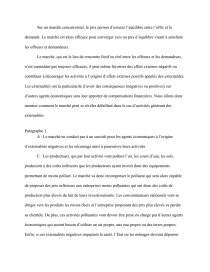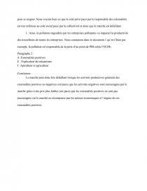 E : Les producteurs, qui par leur activité vont polluer l’air, les cours d’eau, les sols, produisent à des coûts inférieurs que les producteurs ayant investi dans des équipements permettant de moins polluer. Le marché va donc récompenser le pollueur qui sera alors capable de proposer des prix inférieurs aux entreprises moins polluantes qui ont donc des coûts de production plus élevés du fait de leurs investissements. Les consommateurs rationnels vont se diriger vers les produits les moins chers et l’entreprise proposant des prix plus élevés va perdre sa clientèle. De plus, ces activités polluantes vont devoir être prise en charge par d’autres agents économiques qui auront besoin d’utiliser un air propre, une eau propre ou des terres propres. Enfin, si ces externalités négatives impactent la santé, l’Etat ou les ménages devront dépenser pour se soigner. Nous voyons bien ici que le coût privé payé par le responsable des externalités est très inférieur au coût social payé par la collectivité et donc que le marché est défaillant.
