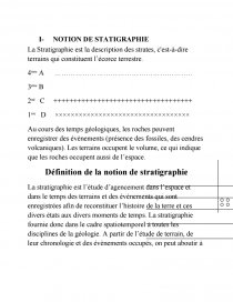 La stratigraphie est l’étude d’agencement dans l’espace et dans le temps des terrains et des évènements qui sont enregistrées afin de reconstituer l’histoire de la terre et ces divers états aux divers moments de temps. La stratigraphie fournie donc dans le cadre spatiotemporel à toutes les disciplines de la géologie. A partir de l’étude de terrain, de leur chronologie et des évènements occupés, on peut aboutir à la reconstitution de l’histoire de la terre. La stratigraphie est donc l’étude des roches et des terrains sédimentaires.