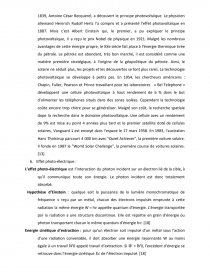 L’effet photovoltaïque est un phénomène physique propre à certains matériaux appelés semi- conducteurs qui produisent de l’électricité lorsqu’ils sont exposés à la lumière. L'histoire de l'énergie photovoltaïque commence au XIXe siècle, le siècle de la révolution électrique. Alessandro Volta crée la pile électrique (1800), en 1827 le hongrois Ányos Jedlik réalise la première dynamo. En 1879, Thomas Edison présente sa première ampoule électrique à incandescence et construit le premier réseau électrique urbain en courant continu (1882). Voyant ici un marché porteur, l'industriel George Westinghouse avec l'aide de l'ingénieur Nikola Tesla, développe un autre réseau électrique en 1886, mais cette fois-ci en courant alternatif. La révolution électrique se fait aussi par la découverte de l'énergie photovoltaïque. En 1839, Antoine César Becquerel, a découvert le principe photovoltaïque. Le physicien allemand Heinrich Rudolf Hertz l’a compris et a présenté l'effet photovoltaïque en 1887. Mais c'est Albert Einstein qui, le premier, a pu expliquer le principe photovoltaïque, Il a reçu le prix Nobel de physique en 1921. Malgré les nombreux avantages de cette énergie propre, le XXe siècle fait place à l'énergie thermique tirée du pétrole. Le pétrole est abondant, très bon marché, il est considéré comme une matière première stratégique, à l'origine de la géopolitique du pétrole. Ainsi, le solaire ne séduit plus, les projets et les découvertes se font plus rares. La technologie photovoltaïque se développe à petits pas. En 1954, les chercheurs américains : Chapin, Fuller, Pearson et Prince travaillant pour les laboratoires « Bel Telephone » développent une cellule photovoltaïque à haut rendement de 6 % dans le but d'alimenter les téléphones situés dans des zones isolées. Cependant la technologie coûte encore trop chère pour se généraliser. Malgré son coût, la recherche spatiale dope la recherche dans le domaine photovoltaïque. Une cellule avec un rendement de 9% est mise au point 4 années plus tard et le premier satellite doté de cellules solaires, Vanguard 1 est envoyé dans l'espace le 17 mars 1958. En 1983, l'australien Hans Tholstrup parcourt 4 000 km avec "Quiet Achiever", la première voiture solaire. Il fonde en 1987 le "World Solar Challenge", la première course de voitures solaires. [13].