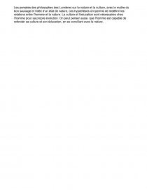 Deuxiement, La culture et l'éducation vont de pair. C'est un moyen pour l'homme de se rapprocher de sa perfectibilité et d'élever sa condition naturelle. C'est ce que pense, par exemple, Kant. Car selon lui, l'homme est la seule créature qui doive être éduquée. Car, il peut utiliser la raison pour comprendre son environnement. Au lieu de penser la nature comme un défaut pour son évolution intellectuelle, il peut y réfléchir sur l’importance qu’elle apporte pour lui-même spirituellement. Par exemple dans les rêverie du promeneur solitaire, Rousseau décrit la nature et à quel point elle apaise son âme. L’ethnocentrisme européen et la société occidentale sont critiqué avec l’émergence du mythe du bon sauvage. Une nouvelle analyse se forme avec Montaigne et Rousseau. En effet, « le bon sauvage » est décrit, dans les Cannibales de Montaigne, comme une jeune humanité vivant dans un paradis terrestre loin de la corruption des européens. Dans le Discours sur l’origine des inégalités parmi les hommes, Rousseau décrit cette période de l’humanité comme étant la plus heureuse et loin d’être une société inégalitaire,mais en équilibre avec la nature. L’exemple du mythe du bon sauvage inspire une nouvelle façon de penser la nature. L’homme serait capable d’être en équilibre avec son environnement.