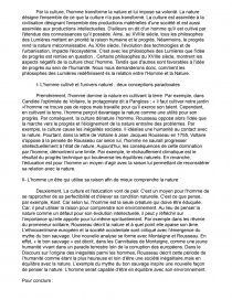 Premièrement, l'homme domine la nature en cultivant la terre. Par exemple, dans Candide l’optimiste de Voltaire, le protagoniste dit à Pangloss : « il faut cultiver notre jardin »l’homme ne trouve pas de repos mais travaille pour qu’il exerce son talent. Cependant, en cultivant la terre, l’homme perçoit davantage la nature comme une utilité pour son progrès. Par conséquent, la culture dénature l’homme. Rousseau oppose alors l'idée que la marche vers le progrès et l'éloignement de la nature entraîne des problèmes. Par exemple, la culture cause les inégalités sociales. Il idéalise une humanité au contact avec la nature. Pourtant, dans la lettre de Voltaire à Jean Jacques Rousseau en 1755, Voltaire s'oppose à la pensée de Rousseau car selon lui, l'homme ne saurait progresser intellectuellement à l’état de nature. Aujourd'hui, les conséquences de cette domination par l'homme, démontrent une limite. Par exemple, le réchauffement climatique est le résultat du progrès technique qui bouleverse les équilibres naturels. En revanche, l’éducation est pour l’homme un moyen d’agir avec la raison lui permettant de reconsidérer sa relation avec la nature.