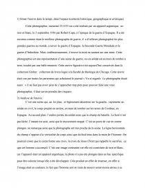 Cette photographie, mesurant 25,5/35 cm a été réalisée par un appareil argentique, en noir et blanc, le 5 septembre 1936 par Robert Capa, à l’époque de la guerre d’Espagne. Il a été reconnu comme étant le meilleur photographe de guerre, il a d’ailleurs photographié les plus grandes guerres au monde, à savoir la guerre d’Espagne, la Seconde Guerre Mondiale et la guerre d’Indochine. Mais, malheureusement, il trouve la mort en sautant sur une mine. Cette photographie est une représentation d’une scène de guerre, où un soldat est en train de tomber à terre, touché par une balle ennemie. Cette œuvre figurative est aujourd’hui conservée dans la collection Gruber : collection de livres logée à la faculté de théologie de Chicago. Cette œuvre était vue par toutes les personnes qui achetaient le journal « Vu et regard». Le photographe disait aussi : « il ne faut pas avoir peur de s’approcher trop près pour pouvoir faire une vraie photographie, il faut savoir prendre des risques».