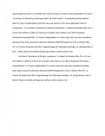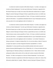Les idées des Lumières ont permis la Révolution française . Ces idées se sont appuyé sur le droit aux libertés fondamental . Il est clair que la Révolution Tunisienne se rapproche de la Révolution française par ces idées et les valeurs d'une démocratie souhaité dans les 2 peuples . Malgré le contexte historique de l'époque la France a quand même pu réussir a se rebeller sans l'aide de réseaux sociaux comme aujourd'hui en Tunisie . En France on utilisait le journal pour parler de la Révolution . Les populations demandaient dans les 2 pays l'émancipation pour tous ainsi que justice et lois soient appliquées selon la Constitution . La