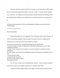 Plus tard, cette lettre inspirera le poète Louis Aragon, qui en composera un poème parlant de ces 23 membres du groupe Manouchiant, morts pour la France. Le poème, intitulé "Strophes pour se souvenir", où il intégrera les dernières paroles de Missak Manouchian. Des paroles tirées de la lettre destinée à Mélinée et qui racontent tout ce qu'il laisse derrière lui en mourant ce jour là.