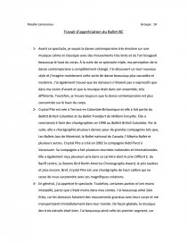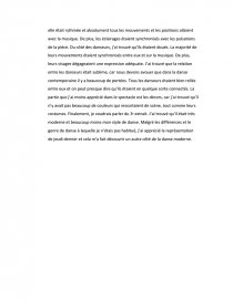 - Avant ce spectacle, je voyais la danse contemporaine très émotive sur une musique calme et classique avec des mouvements très lents et où l'on bougeait beaucoup le haut du corps. À la suite de ce spectacle triple, ma perception de la danse contemporaine a complètement changé. J’ai découvert un tout nouveau style et j’imagine maintenant cette sorte de danse beaucoup plus saccadée et moderne. J’ai également trouvé que les danseurs n’étaient pas si expressifs que dans ma vision d’avant et que la musique était dans son ensemble, très différente. Toutefois, je trouve toujours que la danse contemporaine est plus concentrée sur le haut du corps.