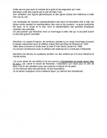 Les rectangles de couleurs représenteraient des blocs d’immeubles côte à côte, les lignes noires seraient la représentation des rues et les couleurs : le jaune symbolise les taxis, et le rouge et le bleu sont la représentation des grandes enseignes colorées new-yorkaise.