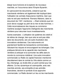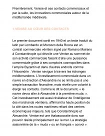 Le premier document sortit en 1940 et un texte traduit du latin par Lombardo et Morozzo della Rocca est un contrat commerciale vénitien signé par Romano Mairano à Constantinople qui dévoile une Venise au sommet de son activité commerciale faisant d’elle une puissance commerciale grâce à ses comptoirs cosmopolites dans l’empire Byzantin et dans d’autres endroits comme l’Alexandrie . Venise navigue à travers les échanges méditerranéens. L'investissement commerciale dans un navire en direction d'Alexandrie ne se limite pas à une simple transaction financière, mais révèle une volonté à élargir les contacts. Comme le dit le document, « le navire devra aller à Alexandrie à la première muda. ». Cet investissement est aussi révélateur de l’intelligence des marchands vénitiens, affirmant la haute position de la cité dans les routes maritimes reliant des centres économiques majeurs, tels que Constantinople et Alexandrie. Venise est une thalassocratie donc son pouvoir réside principalement sur la mer. La stratégie saisonnière de la « muda » ou en français « convoi » désigne l’itinéraire que doit suivre un marin et témoigne de la façon de réagir des marchands vénitiens face aux variations climatiques et saisonnières, soulignant ainsi leur façon de s’adapter dans la gestion des échanges commerciaux. L'exemple additionnel des foires internationales, en particulier la Foire de Champagne au XIIIe siècle, met en évidence la grande volonté de Venise qui est d'étendre ses contacts bien au-delà des frontières méditerranéennes. Parallèlement, le contrat notarié du XIIe siècle entre Domenico Sisinulo et Vitale Voltani ajoute un élément au contact de Venise mentionnant L’empire Byzantin, comme une destination, un lieu où l’investissement peut générer beaucoup de profit « Nous avons établi et formé dans l’empire byzantin une compagna dans laquelle nous avons investi chacun 7 livres d’or » (l 6 à 8). L’empire Byzantin a été un partenaire clé pour venise car il lui a permis d’enrichir encore plus les marchands. Grâce aux avantages que l’empire byzantin a accordé à Venise les marchands n’avaient plus à payer de taxes dans tous les ports méditerranéens sous domination byzantine. Ces privilèges ont renforcé les puissances commerciales de Venise et lui ont ainsi donné acces au produit de luxe d’Orient comme la soie ou encore les épices. Ce qui ainsi favorise l’enrichissement des marchands plus rapidement. À la suite de ces privilèges de plus en plus de contrats similaires a celui du document 2 ont été signé étendant ainsi la portée des échanges vénitiens vers des destination variées, affirmant son rôle de principale cité commerciale accomplissant de nombreux échanges internationaux. Venise est une grande puissance maritime non seulement grâce à sa situation géographique mais aussi grâce a sa domination dans la méditerranée médiévale on le voit notamment à la prise de Constantinople par les vénitiens dans le but de compromettre leur fructueux commerce et de devenir la première puissance maritime.