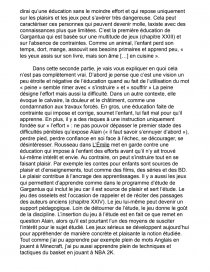 Tout d’abord[c], je vais vous expliquer les avantages de la peine et de l’effort. Je pense qu’il est nécessaire pour un enfant d’avoir des difficultés dans sa vie pour avoir une pratique de l’effort, pour le préparer à sa vie d’adulte car son chemin vaut autant que son objectif. La démarche fondée sur la peine importe autant que les savoirs étudiés dans la mesure où elle développe des capacités et des qualités nécessaires tout au long de sa vie, ce qui permettra à l’enfant d’évoluer, de s’adapter, de comprendre son erreur, de surmonter les difficultés. Si l’enfant veut accéder à un grand savoir, il est nécessaire pour lui de prendre de la peine pour y accéder. L’accès à des connaissances plus élevées exige plus d’efforts, de persévérance et de concentration. On ne peut faire « goûter à l’enfant les sciences et les arts comme on goûte les fruits confits » (Alain). La seconde éducation de Gargantua associe tous les domaines du savoir et sollicite l’enfant à un rythme soutenu : « il lui imposa un tel rythme d’étude qu’il ne perdait pas une heure de la journée ». C’est seulement ainsi que Gargantua peut s’accomplir totalement, comme le dit l’humanisme. « La méthode, bien qu’apparemment difficile au commencement, fut à la longue si douce, si légère et satisfaisante qu’elle ressemblait plutôt à un passe-temps de roi qu’à l’étude d’un écolier » (Rabelais, Gargantua, chapitre XXIV). Les étudiants peuvent réutiliser cette réflexion aux enjeux de leur cursus scolaire par exemple. Être habitué à l’effort peut procurer du plaisir, « les choses de l’esprit qui sont sévères d’abord mais délicieuses » (Alain), plaisir de se voir progresser et d’accéder à des savoirs jusque-là inaccessibles. C’est le « haut plaisir » évoqué aussi par Alain. Par exemple, quand je fais du basket et que je sens que j’atteins un nouveau stade dans mon niveau et que je me perfectionne et que je deviens plus fort, je me sens fier de moi et très heureux. Pour finir, je dirai qu’une éducation sans le moindre effort et qui repose uniquement sur les plaisirs et les jeux peut s’avérer très dangereuse. Cela peut caractériser [d]ces personnes qui peuvent devenir molle, laxiste avec des connaissances plus que limitées. C’est la première éducation de Gargantua qui est basée sur une multitude de jeux (chapitre XXIII) et sur l’absence de contraintes. Comme un animal, l’enfant perd son temps, dort, mange, assouvit ses besoins primaires et apprend peu, « les yeux assis sur son livre, mais son âme […] en cuisine ».