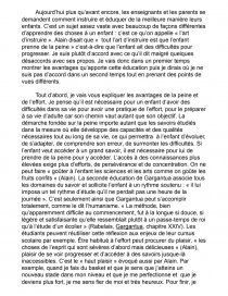 Aujourd’hui plus qu’avant encore, les enseignants et les parents se demandent comment instruire et éduquer de la meilleure manière leurs enfants. C’est un sujet assez vaste avec beaucoup de façons différentes d’apprendre des choses à un enfant : c’est ce qu’on appelle « l’art d’instruire ». [a]Alain disait que « tout l’art d’instruire est que l’enfant prenne de la peine » c’est-à-dire que l’enfant ait des difficultés pour progresser. Je suis plutôt d’accord avec ce qu’il dit malgré quelques désaccords avec ses propos[b]. Je vais donc dans un premier temps montrer les avantages qu’apporte cette éducation puis je dirais où je ne suis pas d’accord dans un second temps tout en prenant des points de vues différents.