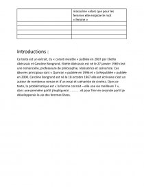 Ce texte est un extrait, du « corset invisible » publiée en 2007 par Eliette Abécassis et Caroline Bongrand, Eliette Abécassis est né le 27 janvier 1969 c’est une romancière, professeure de philosophie, réalisatrice et scénariste. Ces œuvres principaux sont « Qumran » publiée en 1996 et « la Republiée » publiée en 2000. Caroline Bongrand est né le 18 octobre 1967 elle est écrivaine c’est un auteur de nombreux roman et d’un essai et scénariste de cinéma. Dans ce texte, la problématique est « la femme connait – elle une vie meilleure ? », dans une première partit j’expliquerai ……… et pour finir en seconde partit je développerais la vie des femmes libres.
