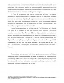 Les champs de la violence comme les « ressources financières » ou le « contrôle de la population sur son territoire » ou encore le « pouvoir de décréter les lois » exprimés par Juan José Linz se retrouvent dans la définition webernienne de l’Etat. Les définitions données ici de l’Etat font appel à une notion importante qui est l’expression de la domination de l’Etat. Selon Carl Schmitt les populations sont soumises à l’Etat comme un Dieu, étant de facto légitime mais pour Weber il faut que les populations soient prêtes à obéir. Pour reprendre Weber, il définit 3 modes de légitimations : la traditionnelle, la rationnelle-légale et enfin la charismatique. La légitimité traditionnelle accorde beaucoup d’importance aux croyances, aux normes coutumières héritées du passé. Elle a été privilégiée par un système féodal. L’autorité du chef réside dans la sa situation personnelle ainsi que sa filiation. La légitimité rationnelle-légale accorde l’autorité au statut de la fonction dirigeante tant qu’elle procède d’un ensemble de règles. Une personne physique possède une autorité seulement en raison de sa fonction. Elle s’incarne dans un corps de fonctionnaire d’État qui ont été choisis pour leurs compétences. Leur contrat est écrit et non pas vassalique comme dans un système féodal. Le système bureaucratique est celui mis en place dès le VIIème siècle en Chine où les Mandarins étaient des fonctionnaires lettrés et éduqués sélectionnée par concours. Enfin la légitimité charismatique repose sur la personnalité du leader. C’est le cas des dictatures avec notamment Hitler. Cette légitimité s’avère dans les faits assez fragile car elle s’appuie principalement sur les émotions. Pour prendre l’exemple du régime français, la légitimité de l’Etat se rapproche du modèle rationnelle-légal. C’est un système bureaucratique donnant le pouvoir à des fonctions et non à des personnes. De plus, le corps de fonctionnaire est recruté sur concours. C’est ainsi que l’Etat français semble pouvoir prendre des mesures légales restrictives notamment dans le cadre de la gestion de la crise de la COVID-19 sans provoquer une protestation massive de la population. `