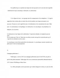 Ici on peut voir que c'est un chien qui est mis en scène dans une voiture sur la banquette arrière noir, le chien est coincé dans le siège, et il lutte pour rester accroché. A sa tête on peut comprendre que le chien est surpris de la vitesse de la voiture en faisant de gros yeux, et avec les traces de griffes il n'a pas pu résister longtemps au moteur, le slogan situé en bas de l'affiche “La Golf TDI. Vraiment puissante.” nous aide à la comprendre et accentue encore plus sur la puissance de la voiture, même l'animal en est resté “scotché” au siège ! La marque a choisi de créer cette publicité afin de mettre en avant la puissance de la Golf TDI, une puissance qu'elle n'avait pas avant, elle a tourné cette publicité de façon comique, ce qui est plutôt bien réussit pour le lancement du nouveau produit Volkswagen de 2012. Cette pub a rencontré un grand succès, tout comme le produit, puisqu'elle a été élue “Publicité de l'année” à Cannes.