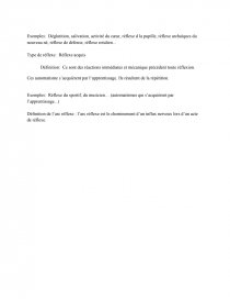 Exemples: Déglutition, salivation, activité du cœur, réflexe d la pupille, réflexe archaïques du nouveau né, réflexe de défense, réflexe rotulien...