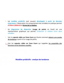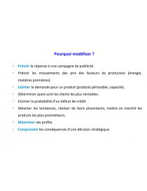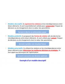 - Modèles prédictifs: ils proposent des formes de relation afin de décrire les interdépendances entre divers éléments. Ils sont utilisés pour prévoir l’impact de décisions ou de changements dans la valeur des paramètres.