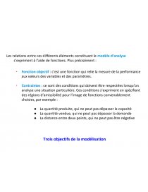 - Contraintes : ce sont des conditions qui doivent être respectées lorsqu’on analyse une situation particulière. Ces conditions s’expriment en spécifiant des régions d’amissibilité pour l’image de fonctions convenablement choisies, par exemple :
