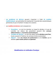 - Paramètres : ce sont les données sur lequel le décideur n’a pas de contrôle. Les valeurs des paramètres peuvent être connues (déterministes) ou incertaines (stochastiques).