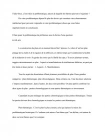 Plan chronologique : c’est un plan délicat qui oblige parfois à des contorsions, mais qui s’adapte parfaitement à certains types de sujets. Ce plan ne doit pas jamais se limiter, pour autant, à une énumération de dates ou d’événements. Comme tout plan, il doit s’ordonner autour d’une problématique pertinente. Le choix des césures chronologiques doit épouser les axes de la problématique. On veillera également au bon équilibre dans le découpage du temps.