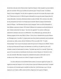 Deuxièmement et pour finir, l’occupation et la collaboration qui s’en suit. L’occupation du territoire reste une sévère blessure dans l’esprit des français. Cette occupation qui sera totale à partir de novembre 1942 et qui est même une annexion pour l’Alsace-Loraine. "la Solution finale, le travail obligatoire" lors de cette occupation les nazis ont mis en place des projets ou des lois. D’abord pour œuvrer à l’effort de guerre allemand en envoyant de jeunes français dans les usines allemandes. Ensuite les allemands mettent en place la Shoah. Elle consiste en des rafles sur les juifs partout en France et en Europe pour les amener dans les camps d’extermination situer en Pologne. "une Résistance de plus en plus énergique" toute ces actions allemandes et leurs défaites consécutives depuis 1942 attises la flamme de la résistance qui devient de plus en plus violente surtout dans les maquis. "une erreur de jugement" Ces actions n’affecte pas seulement la résistance mais aussi la collaboration. Une collaboration qui commence dès la fameuse poignée de main entre Hitler et Pétain. Vichy envoyé volontairement de jeune français en Allemagne pour y travailler. Le régime prend aussi des initiatives antisémites seul et participe activement aux rafles comme celle du Vélodrome d’Hiver en juillet 1942. "L’inertie