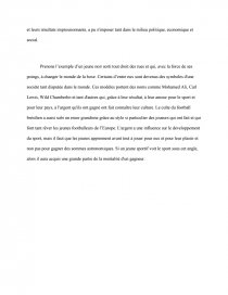 Prenons l’exemple d’un jeune noir sorti tout droit des rues et qui, avec la force de ses poings, à changer le monde de la boxe. Certains d’entre eux sont devenus des symboles d'une société tant disputée dans le monde. Ces modèles portent des noms comme Mohamed Ali, Carl Lewis, Wild Chamberlin et tant d'autres qui, grâce à leur résultat, à leur amour pour le sport et pour leur pays, à l'argent qu'ils ont gagné ont fait connaître leur culture. Le culte du football brésilien a aussi subi un essor grandiose grâce au style si particulier des joueurs qui ont fait et qui font tant rêver les jeunes footballeurs de l’Europe. L'argent a une influence sur le développement du sport, mais il faut que les jeunes apprennent avant tout à jouer pour eux et pour leur plaisir et non pas pour gagner des sommes astronomiques. Si un jeune sportif voit le sport sous cet angle, alors il aura acquis une grande partie de la mentalité d'un gagneur.