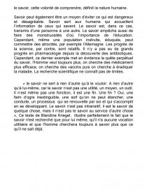 Pourtant, nous savons que le savoir est utile. C’est utile de savoir où se trouve la nourriture. C’est utile de connaître le trajet qui mène au lycée. Alors, comment passe-t-on de l’utilité des savoirs en particulier, à l’utilité du savoir lui-même ? Rien n’est utile en soi, si ce n’est pour atteindre une fin. Par exemple la science des particules n’est d’aucune utilité pour comprendre la religion. Le savoir ne sert pas de la même manière pour tous. Par exemple, dans le domaine de la recherche, le savant est-il heureux ? pas forcément car il prend conscience de son ignorance et du caractère irrémédiable de ce constat. Beaucoup de question demeurent sans réponse et lui procure un manque une souffrance. C'est le constat de l'ignorance qui amène à la recherche de savoir, car ce constat est un caractère insupportable pour l'Homme.